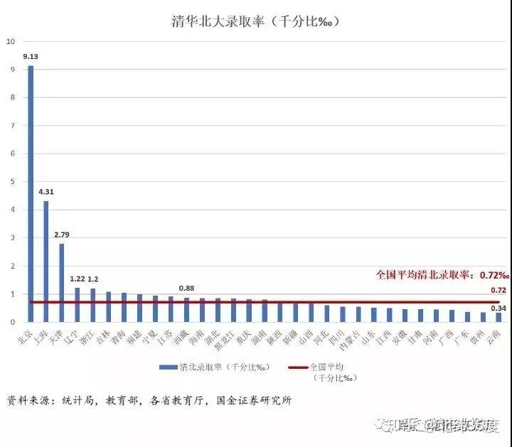 北京的清北录取率9.1‰,而云南的清北录取率近0.34‰,相差二十几倍,有点方差过大,这和清华北大本身在北京当然也有一定关系。上海4.31‰,天津2.79‰,京津沪依然是雄踞前三,而且和其他省市差距相当之大。其他清北录取率较高的地区包括辽宁,浙江,吉林,青海等。
