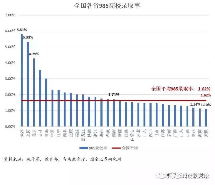 从985录取率来看,全国平均大约是1.62%(这个是所有高考考生为分母,而不是所有高考适龄人口做分母)。